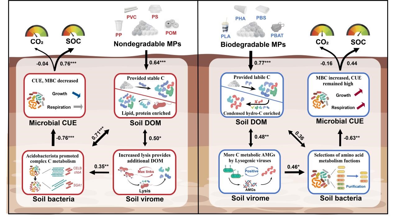 基于此,中国科学院城市环境研究所朱永官院士团队区域土壤环境与生物污染研究组利用微塑料污染长期野外控制实验,结合多组学、土壤化学多样性和微生物碳利用效率分析,研究微塑料污染下碳循环变化的微生物机制。结果表明,不可降解塑料处理中,病毒裂解的增加缓解了碳可利用性限制,但裂解物的引入有利于微生物的复杂碳水化合物代谢,更多的碳用于代谢中的能量投资而降低了土壤微生物固碳潜力。相反,可生物降解微塑料处理中,病毒通过辅助代谢增强了主要富营养细菌的碳利用能力,从而显著提高土壤微生物固碳潜力。这些结果也在相应的土壤塑料际中得到证实,强调了病毒调节微塑料污染下土壤储存环中的作用。