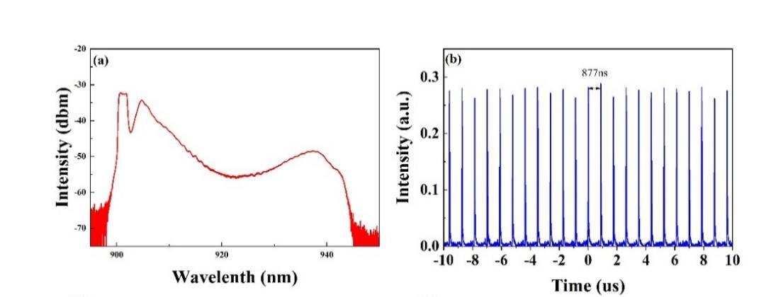 图2 0.9μm脉冲锁模激光器光谱与脉冲序列