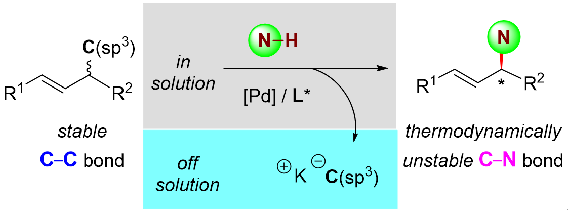 非张力C(sp3)-C(sp3)键的催化不对称官能团化是一种具有高应用潜力的转化方法,可以立体选择性地编辑分子骨架,但目前研究还比较局限。近日,该课题组实现了烯丙位烷基C-C键的催化不对称胺化反应(图1)。在已知的不对称烯丙基取代反应中,C-C键的形成被认为是热力学有利的过程。而在此工作中,作者通过溶解度控制方法,使烯丙位上脱除的烷基盐不断从反应液中析出来驱动反应,从而将非张力的烯丙基烷基C−C键立体选择性地转化为C−N键。该策略使得热力学上被认为不利的过程成为了可能,完成了传统Tsuji-Trost反应历程的翻转。机理研究表明,C−N键的形成是反应的决速步,且C-C键断裂形成的盐在非极性溶剂中溶解度很低,推动了反应的进行。