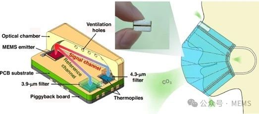 图1 超小型双通道集成CO₂红外气体传感器原理图及可穿戴呼吸检测装置