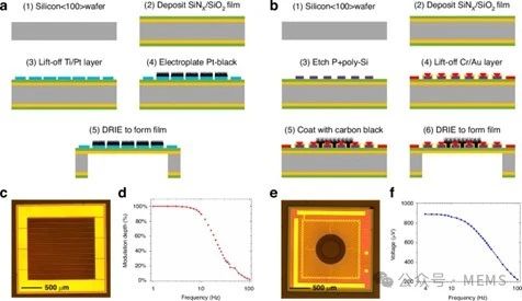 图2a展示了高发射率MEMS光源的制造工艺。图2b展示了高探测率热电堆探测器的制造工艺。图2c展示了MEMS工艺制造的光源。在热电堆红外探测器的薄膜区域表面,共有88对热电偶(如图2e)。
