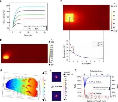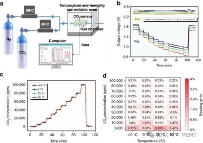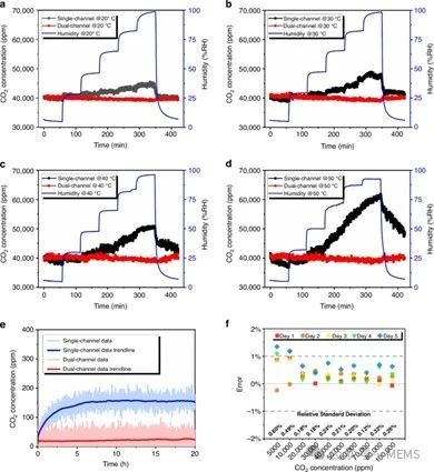 图5a为超小型CO₂传感器的校准和测试平台。研究人员利用该平台对超小型CO₂传感器特性进行了测试。随后,研究人员测试了超小型CO₂传感器的响应速度,图6展示了该传感器的响应时间和恢复时间。此外,超小型CO₂传感器的湿度特性对于呼吸气体监测至关重要。图7a至图7d显示了超小型CO₂传感器在四种温度下的湿度特性,并提供了每种温度下的单通道拟合数据和双通道差分数据。