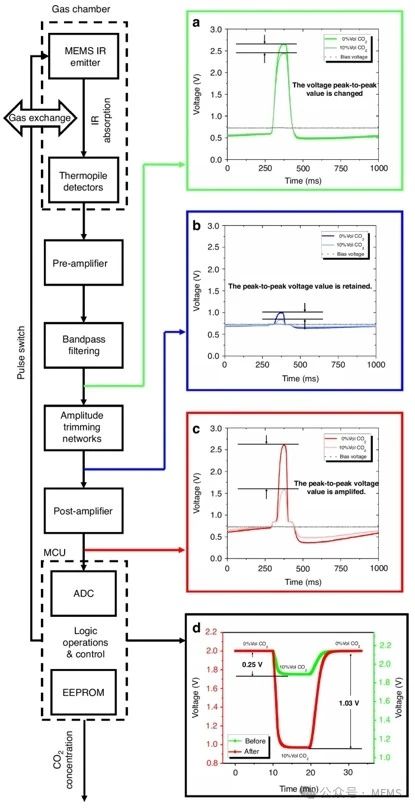 在超小型集成CO₂红外气体传感器内,MEMS光源用于产生高温辐射中红外光。热电堆探测器通过温差输出其响应,通常对温度变化非常敏感,尺寸缩小对热管理提出了挑战。研究团队采用COMSOL软件中的瞬态模拟方法,模拟了传感器内部的温度平衡过程和热传递趋势,相关结果如图3所示。有效利用来自MEMS光源的红外光信号可以克服噪声限制,并提高传感器灵敏度。图4展示了超小型CO₂红外气体传感器的信号处理过程。