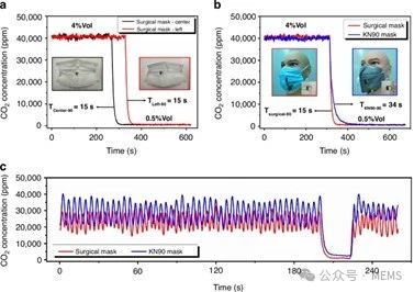 最后,研究人员设计了一种基于面罩平台的可穿戴呼出CO₂监测系统,对超小型CO₂传感器进行了初步研究,相关实验结果如图8所示。