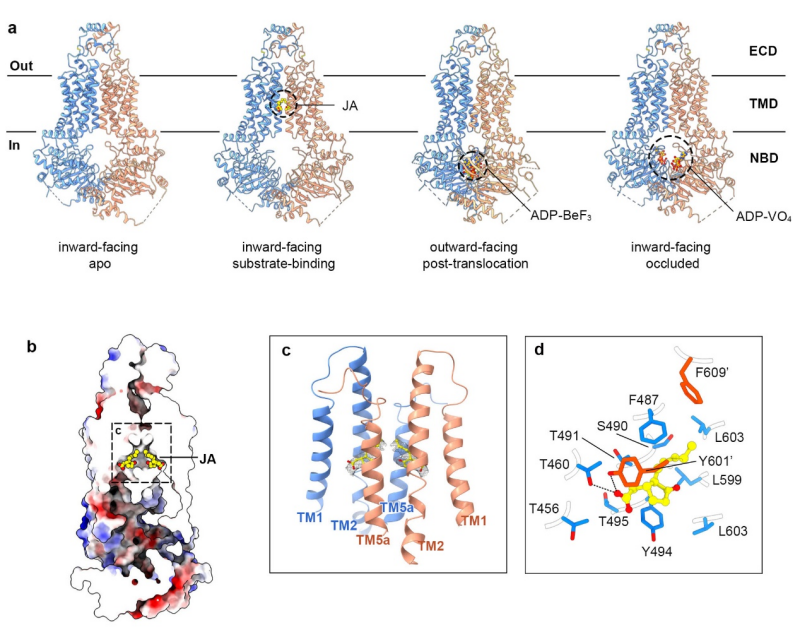 该项研究不仅揭示了AtABCG16特异识别并跨膜转运JA的分子机理,解决了AtABCG16在转运底物上的争议,而且丰富了ABC转运蛋白的跨膜转运机制。