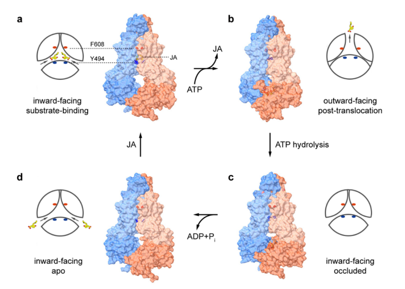 研究人员通过比较AtABCG16的不同构象,发现其在胞质侧具有两个独立的底物入口,分别通往各自的底物结合口袋,并与二聚体组成的跨膜转运通道相连。两个芳香族氨基酸Y494与F608分别位于底物入口和跨膜转运通道中,分别控制了二者的开闭。这一独特的结构特征决定了AtABCG16转运蛋白的跨膜转运机制与已知的ABC转运蛋白有明显不同。基于结构和生化分析,研究人员提出了AtABCG16介导的JA跨膜转运的工作模型(图2)。
