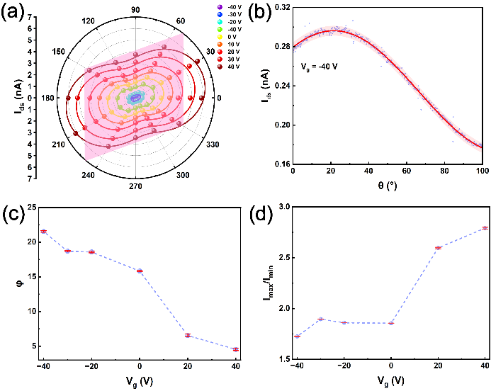 图2. (a) 在不同栅极电压下测量的光电流响应极坐标图。实线表示对实测数据的拟合结果。晶体轴b轴(红色菱形的一侧)平行于最大电流的方向。(b) 在−40 V栅极电压下,小偏振角步进测量光电流响应。(c),(d) 提取了不同栅极电压下的偏置角和二向色性比。