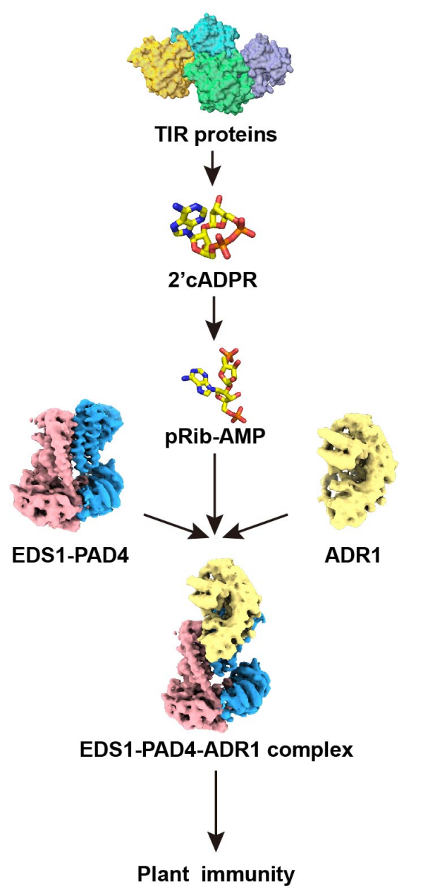 在TIR蛋白引起的ETI免疫反应中,含有TIR结构域的受体蛋白(TNLs和TIR only)发挥其自身的NAD+水解酶活性,产生小分子信号物质pRib-AMP/ADP以及2’cADPR。这些信号分子如何调控EDS1-PAD4-ADR1模块,影响植物免疫反应还有待深入研究。