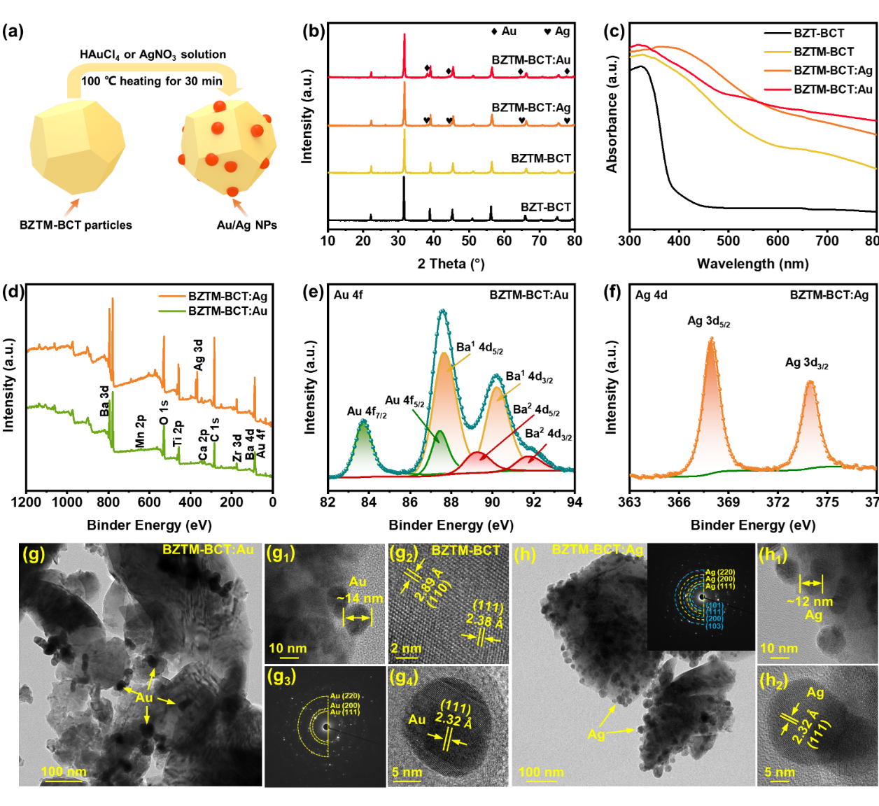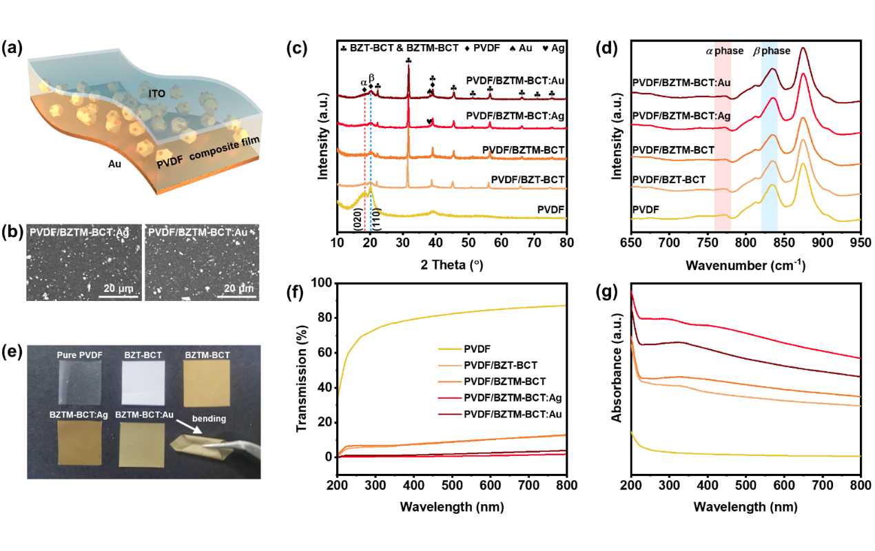 图2. 柔性铁电复合薄膜PVDF/BZTM-BCT:Au/Ag的结构和物理性能表征。