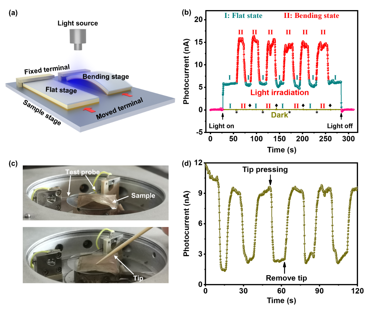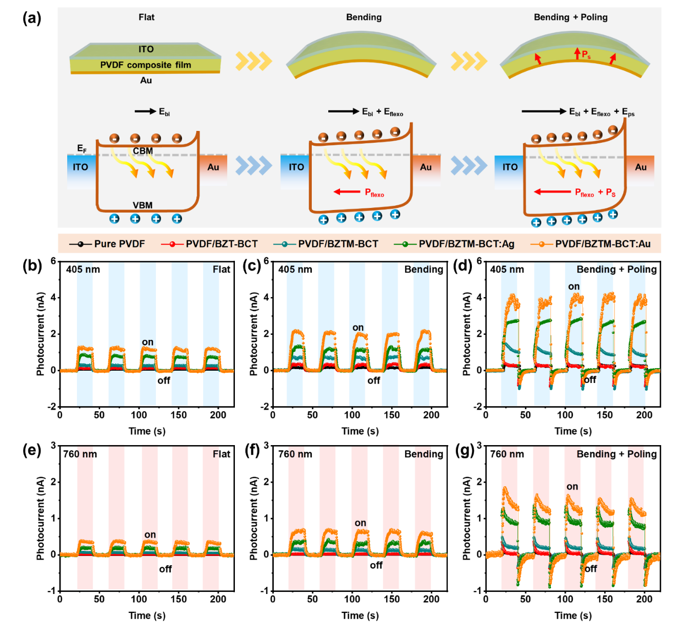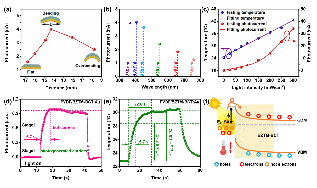 近日,中国科学院上海硅酸盐研究所在柔性铁电复合薄膜光电响应提升研究中取得新进展。通过在铁电陶瓷粉体BZTM-BCT表面负载Au和Ag金属纳米颗粒,然后将其嵌入有机铁电薄膜PVDF,制备了一种柔性铁电复合薄膜PVDF/BZTM-BCT:Au/Ag,相较纯PVDF薄膜,复合薄膜具有高达93%的铁电相含量以及明显的可见光吸收。“弯曲+极化”状态下复合薄膜的光电流比纯PVDF提升达57倍。机理研究表明,该状态下,挠曲电极化与铁电极化协同促进了光生载流子的分离和传输;此外,Au和Ag金属纳米颗粒中的电子在光热激发后穿过肖特基结进入BZTM-BCT中,增加了光生载流子浓度,两者协同作用促进了光电性能的提升。器件测试表明,该复合薄膜不仅可以感知光,还可以监测与其接触物体的移动与形变,展示了在多功能光电传感器应用中的巨大潜力。相关研究成果以“Ferroelectric, flexoelectric and photothermal coupling in PVDF-based composites for flexible photoelectric sensors”为题发表在Materials Horizons (2024, DOI:10.1039/d4mh00667d)。论文第一作者为上海硅酸盐所博士研究生王路,指导教师易志国研究员。该工作获得国家自然科学基金,上海市自然科学基金和中国科学院前沿科学重点项目等资助。链接:https://doi.org/10.1039/D4MH00667D