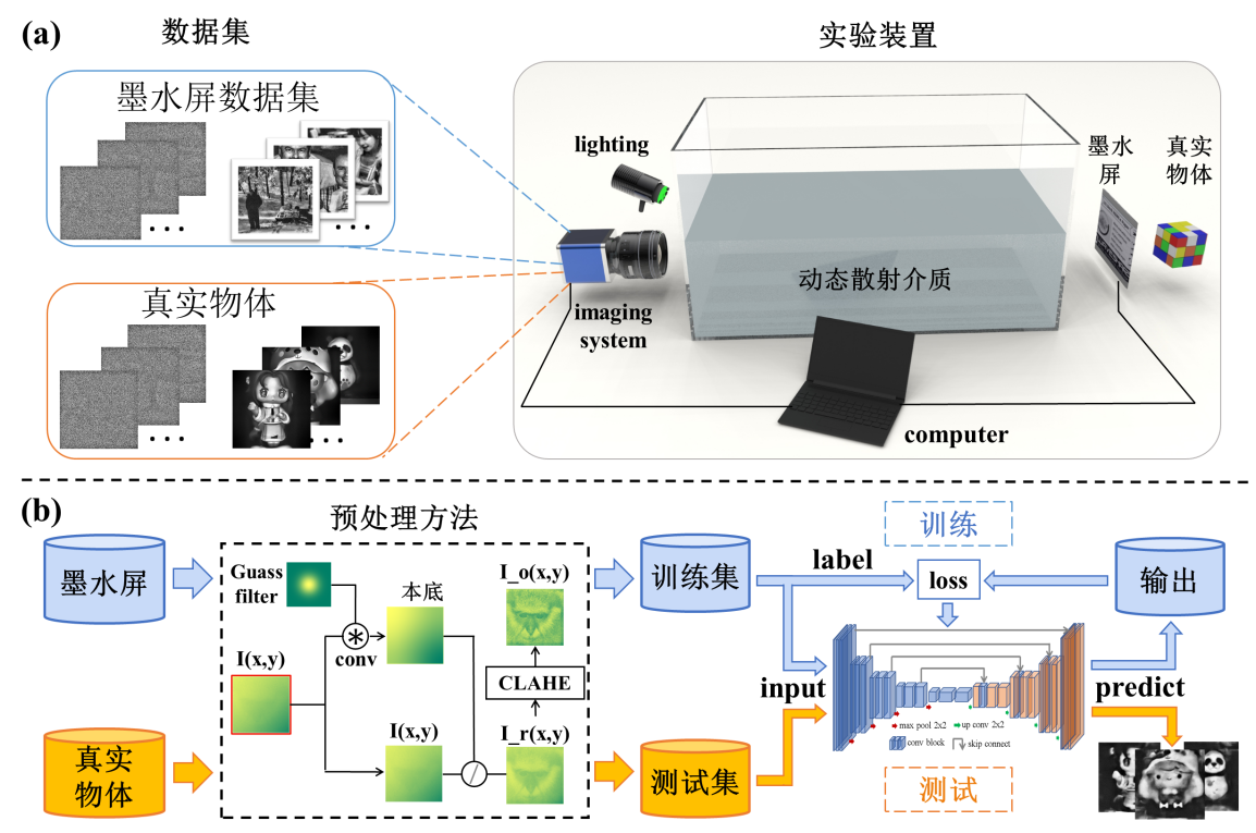 图1:DescatterNet算法框架。(a)实验装置。利用不发光且漫反射的墨水屏模拟真实物体,采集模拟真实散射场景的数据集。(b)数据处理流程。首先利用数据预处理方法消除不均匀本底同时增强图像特征,然后训练优化的网络模型,最终应用于真实物体和真实场景的散射成像。