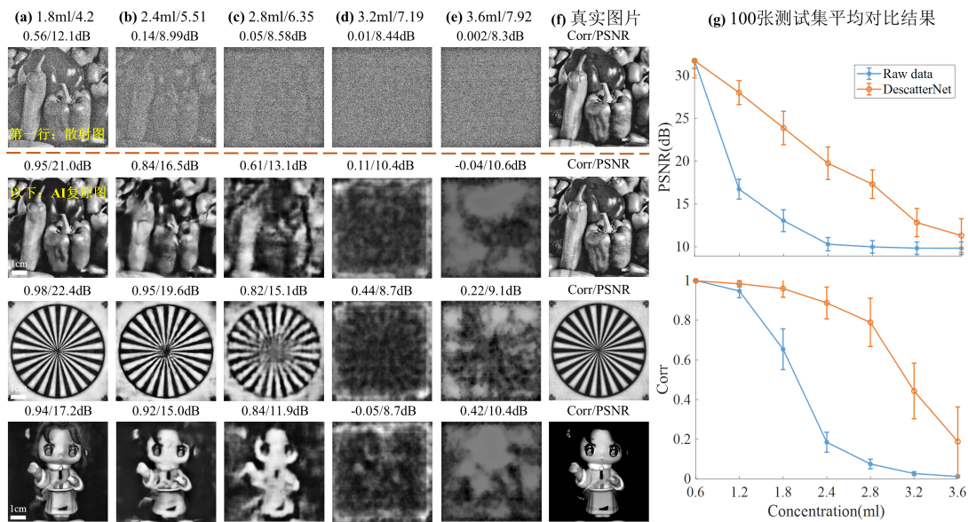 如图2所示,随着散射程度加深,原始散射图像迅速退化,并完全无法分辨。 DescatterNet对真实物体实现了高质量的散射成像,大大提高了成像系统的探测性能。