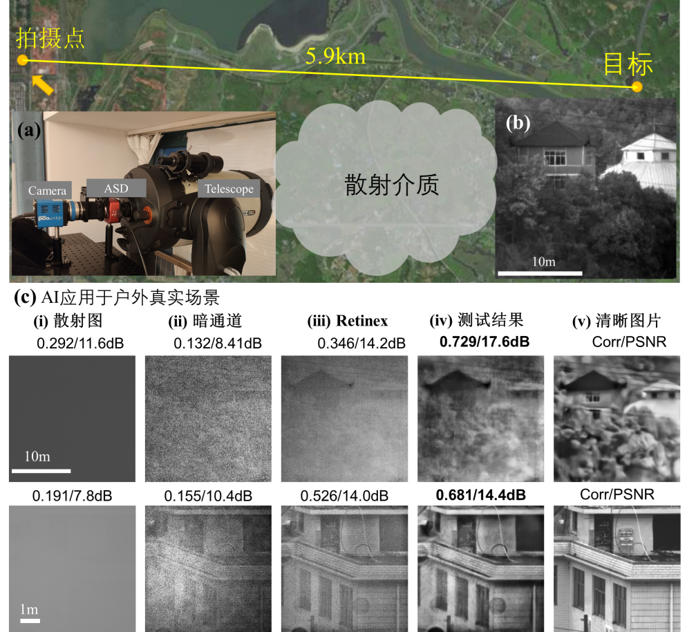 在前面工作基础上,研究人员进行了自然场景的散射成像实验,并搭建了如图3a所示的成像装置。在这项实验中,该研究成功实现了透过户外5.9km的浓雾环境对自然场景进行散射成像。传统图像增强方法比如暗通道和Retinex等都难以复原出清晰图像,而DescatterNet则取得最优的复原结果。