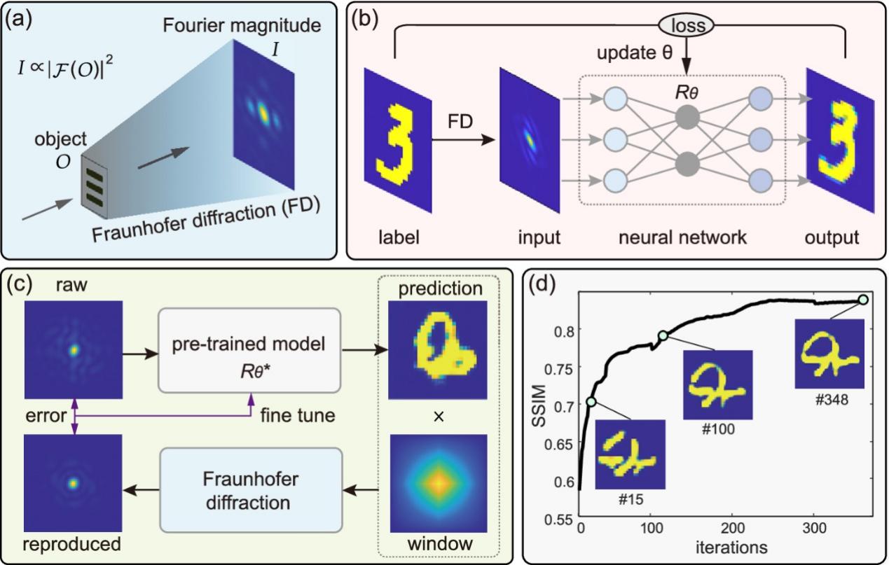 傅里叶域相位恢复,即从傅里叶变换的强度值(振幅的平方)去恢复物体,是一个应用极为广泛的问题。由于缺乏相位信息,物体和单纯的强度测量值之间的映射并不唯一,给问题带来了极大的病态性。通常情况下,使用不同的编码进行测量可以收集更多的信息,但是需要更复杂的设计和计算,也需要采集多张图像;如果通过交替投影或者压缩感知方法可以从一张图像重建物体,但是收敛性得不到保证;如将问题转化为凸优化可以保证收敛,但是计算起来很复杂,而且需要随机的高斯采样。近年来,深度学习通过大量的数据来学习如何从测量值中重建出物体,这样可以大大减少重建所需的计算时间。但是,这种方法也有它的局限,如在收集训练数据、应用到不同情况的泛化性以及结果的可解释性方面都存在一些问题。