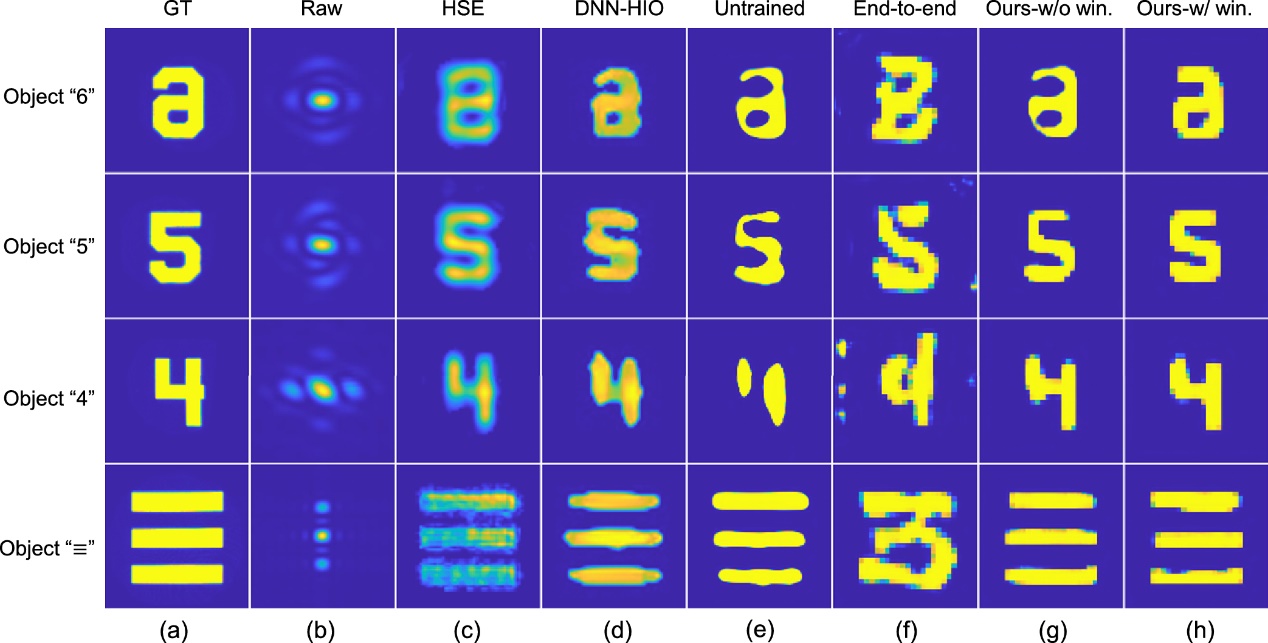 图 2.从相干衍射成像实验中恢复的图像。(a)相机拍摄的真值图像。(b)原始测量的傅里叶测量(缩放)。我们利用不同的重建算法从(b)所示的模式中恢复对象图像,从而得到 HSE (混合输入-输出 + 收缩包装 + 减少误差) (c)、DNN-HIO (深度神经网络辅助的混合输入-输出) (d)、未训练 (e)、端到端 (f)、没有 (g) 和有 (h) 巴特利特窗口的方法。