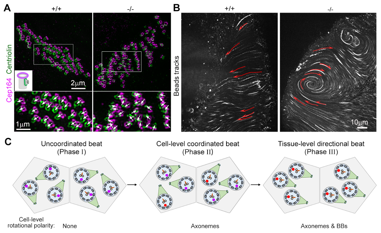 (A)相对野生型(+/+)小鼠,Ccdc57敲除(-/-)小鼠脑室管膜细胞多纤毛的基体不能形成一致的极性。Cep164标记基体,而Centriolin标记基足,箭头表示基足方向。(B)Ccdc57敲除导致脑室管膜上皮细胞纤毛驱动的液体流动缺乏定向性(红色箭头)。(C)模型图展示新生纤毛的轴丝方向(箭头)与基足(绿色)在阶段I未偶联,此时Ccdc57呈现随机的点状定位(紫红)。此时细胞内多纤毛的摆动方向是混乱的。在阶段II中,细胞内的轴丝方向逐渐统一,其中一部分与基足偶联,Ccdc57也相应呈现极性定位(红色)。这时同一细胞内的多纤毛实现定向摆动,但不同细胞缺乏一致性。在阶段III中,轴丝方向与基体极性完成偶联,从而实现纤毛在组织层面上的定向摆动(PCP)。