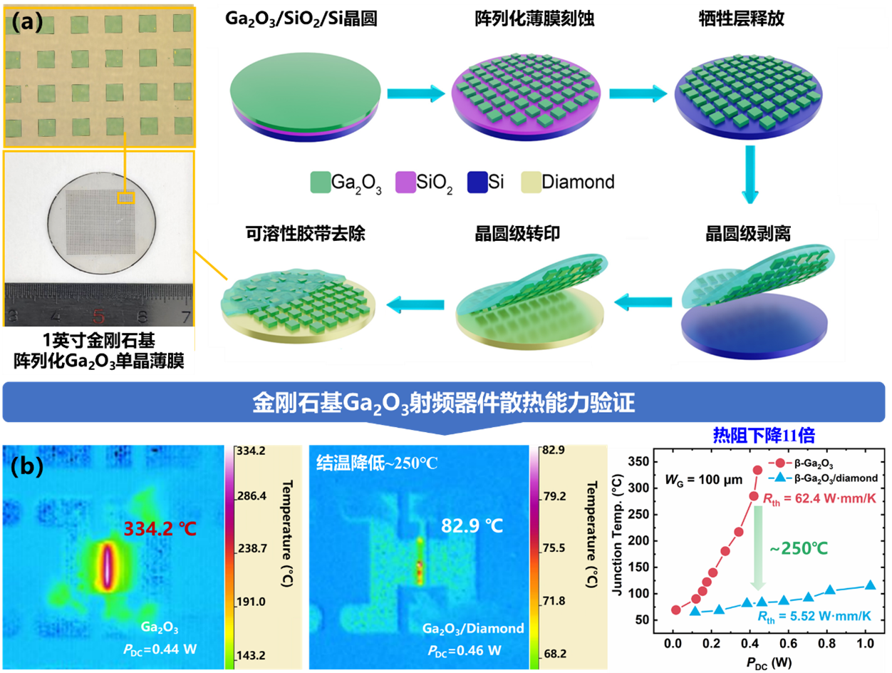 图 2. (a)1英寸金刚石基阵列化氧化镓单晶薄膜及其制备流程,(b)金刚石基氧化镓与氧化镓同质薄膜 RF MOSFET器件结温和器件热阻对比