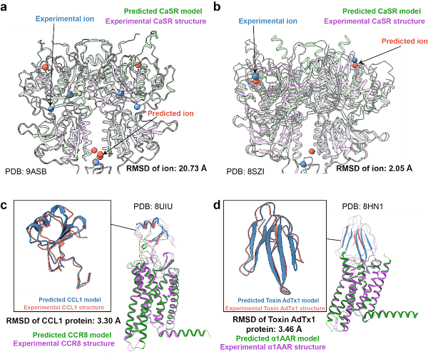 图3展示了对离子和蛋白类配体的预测结果。在CASR(图3a、b)中,不同数量的钙离子对应不同的预测表现。当配体中包含6个钙离子时,实验结构中的钙离子位于胞外区中部,而预测模型中的钙离子则分布在上端和下端,位置差异较大(20.73埃)。相比之下,当配体中包含4个钙离子时,实验结构和预测模型中的钙离子位置均位于上端和下端,表现出较高的一致性。这表明离子数量与预测准确度之间存在相关性。