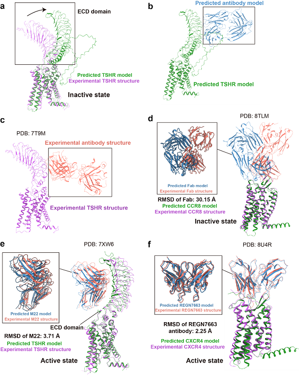 考虑到抗体分子在药物开发中的重要性,本文特别将抗体作为单独模块进行评估,并纳入了重要药物靶标TSHR。如图4a-d所示,失活态的抗原-抗体复合物预测表现不佳。尽管存在抑制剂形式的抗体,AF3仍将TSHR胞外区预测为激活态构象,且抗体的朝向由指向细胞膜转变为与细胞膜平行,说明AF3预测结构可能受到激活态构象的影响。在CCR8的自主研发抑制剂抗体复合物预测中,AF3预测了与实验结构不同的表位和抗体朝向,导致RMSD超过30埃,未能成功识别抗体和受体的结合。