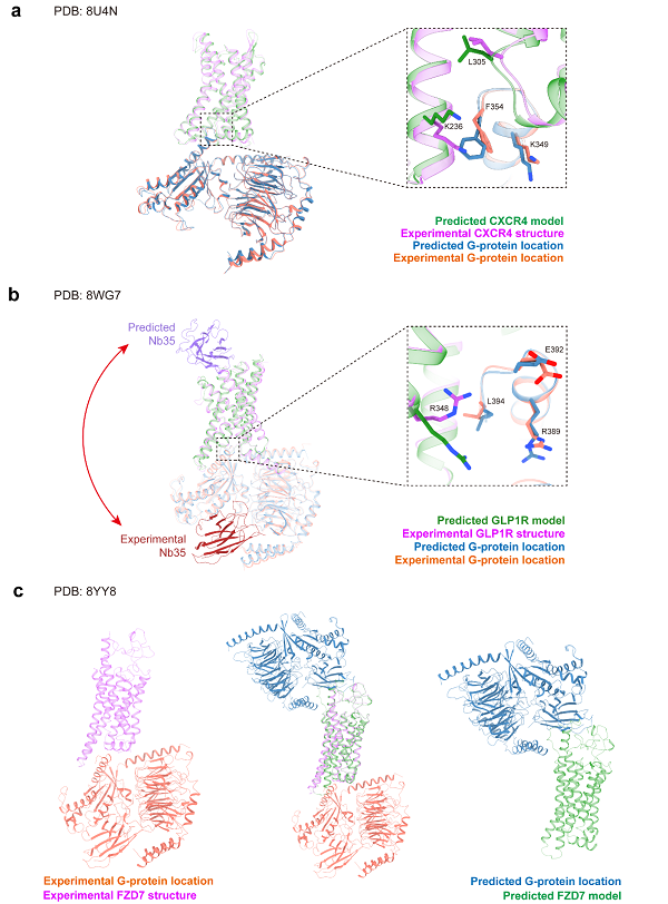 在B类GPCR的建模中,尽管GPCR-G蛋白复合物仍然得到了正确建模,但抗体被错误地建模在胞外区,实际结合位置应该位于G蛋白三聚体附近,这反映了AF3在建模抗体结构时的不确定性。此外,G蛋白与受体的界面残基侧链朝向也存在差异。