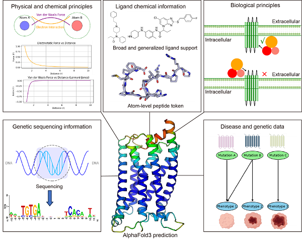 图7展示了一些可能的算法改进方向。例如,引入物理化学原则的编码信息可能有助于减少配体与受体之间的碰撞;对多肽类配体进行原子级建模可能提升其预测能力;此外,类似于ESM3在结构预测中引入功能信息的做法,在AF3中引入生物学原则的信息可能帮助避免G蛋白位置预测的重大失误,基因测序信息以及突变与表型之间的关联信息也可能提供有价值的参考。在这些改进下,AF3的预测有望为序列-结构-功能关系提供更全面的理解,并为药物设计提供更强有力的支持。