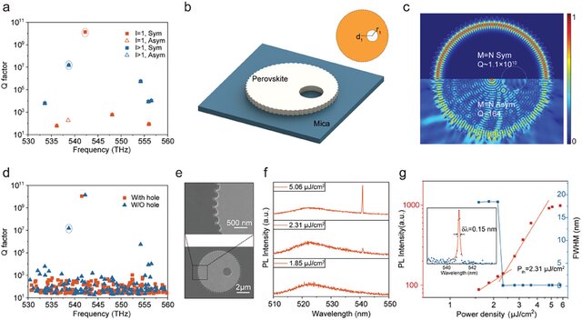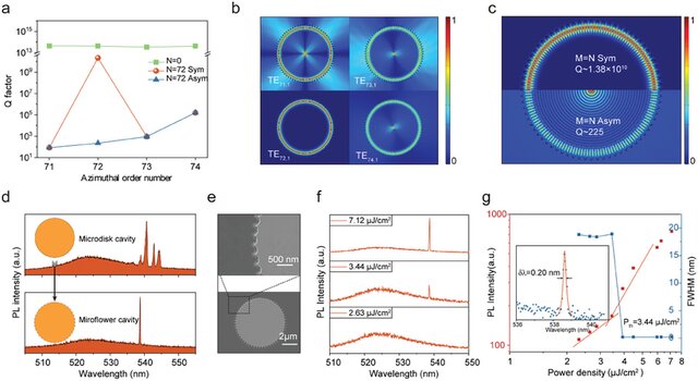 作为概念验证,研究人员采用精细加工技术在微盘腔上引入外围角光栅破缺结构,有效地消除了不匹配的竞争模式,实现了单模激光输出。进一步通过引入挖孔来抑制剩余的高阶激光模式,优化了激光特性。值得注意的是,所制造的激光光源,被称为模式结构破坏激光器,展示了卓越的单模激光特性,包括稳定性、超低阈值(约2.31 μJ/cm²)和窄线宽(约0.15 nm)。相关研究为超低阈值、可调谐单模激光器的发展提供了新的途径,同时对在光子集成电路中构建片上激光阵列尤为重要。