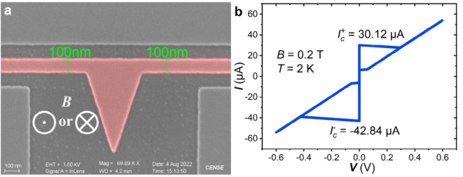 图1 a. 超导纳米线二极管的扫描电镜图。 b. 超导纳米线二极管的非互易电输运特性