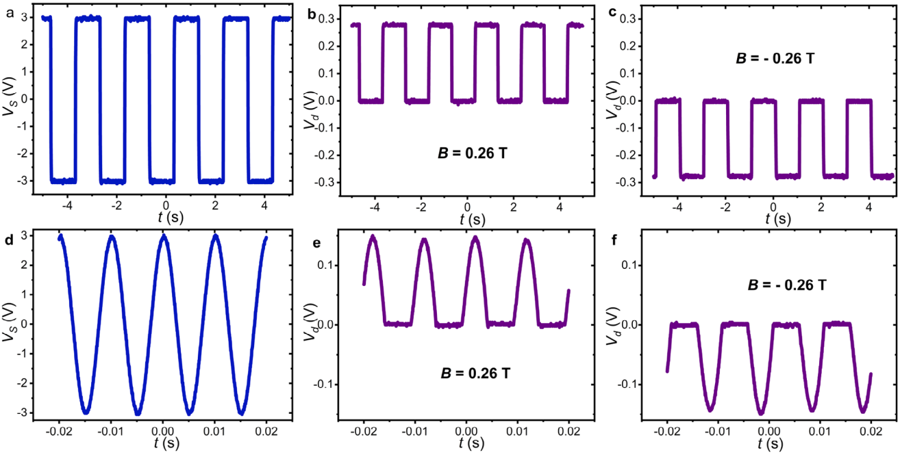 此外研究人员还利用超导纳米线二极管演示了其对方波和正弦波的整流特性,如图2所示。当给超导纳米线二极管施加一个幅值处于正向临界电流和反向临界电流之间的一个方波或正弦波信号时,由于超导纳米线二极管的非互易电输运特性,其只在单一方向上偏置电流可以无阻地流通,在反方向上则输出相应的电压信号。