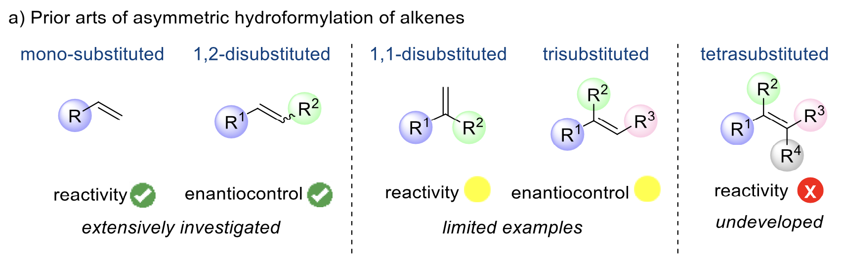 氢甲酰化反应以烯烃、氢气和一氧化碳为原料在过渡金属催化下以完美的原子经济性转化为醛,在有机合成和精细化工领域具有广泛的应用。通过探索金属铑/手性膦配体催化体系发展高效的不对称氢甲酰化反应,实现手性药物或精细化学品的快速合成近年来备受关注,但进展仍然有限。总而言之,单取代和1,2-二取代烯烃的不对称氢甲酰化研究较多,反应活性和立体选择性控制问题已基本解决;1,1-二取代和三取代烯烃的不对称氢甲酰化反应仍很有限,反应活性和手性控制仍是挑战;而四取代烯烃的不对称氢甲酰化反应非常罕见(图1)。