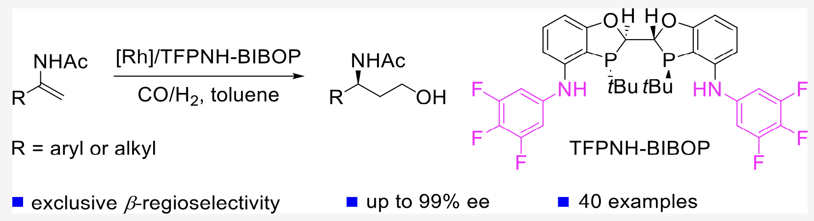 该工作发展的一系列4,4'-芳胺基取代的手性BIBOP配体有效促进了α-取代烯酰胺的铑催化不对称还原氢甲酰化反应,并为手性1,3-氨基醇结构的高效构建提供了新策略;原创性膦配体结构的发展以及配体和底物之间相互作用对催化效率的影响为构建更高效的催化体系、进一步拓宽不对称氢甲酰化反应具有指导意义。上海有机所博士生朱雨欣和博士后张宇辰是该论文的共同第一作者,杨贺副研究员、薛小松研究员和汤文军研究员是共同通讯作者,该研究工作得到了国家自然科学基金委和科技部的资助。