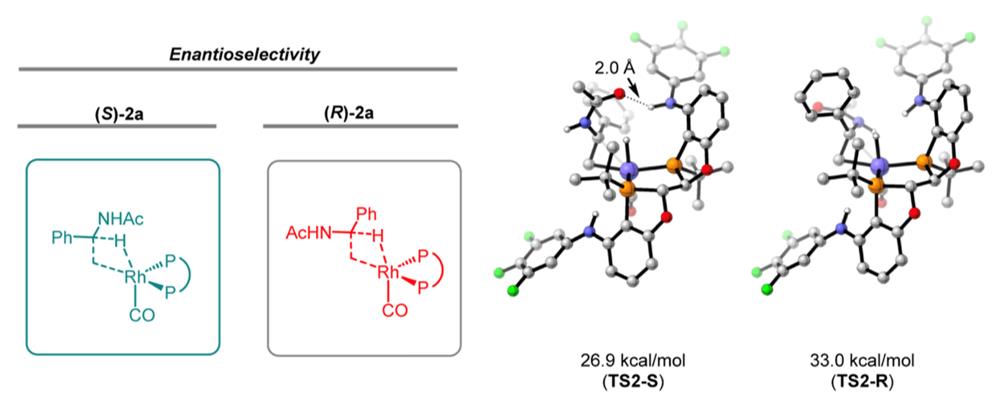 团队基于在发展P-手性膦配体及不对称氢化领域的研究经验 (Acc. Chem. Res.2019, 52, 1101−1112),挑战N-(1-苯基-乙烯基)-乙酰胺的不对称氢甲酰化反应。不出意外,极大部分商业化手性配体表现出没有活性或很低的产率。当采用4,4'-芳胺基取代的手性BIBOP配体时,产率和立体选择性有大幅度提高。进一步研究表明,具有吸电子取代基的4,4'-芳胺基取代的BIBOP配体有助于反应活性和立体选择性。当采用TFPNH-BIBOP为配体时,不对称还原氢甲酰化产物的产率达80%,立体选择性达96%ee。该反应适合具有不同位点、不同电性取代基的α-苯基烯酰胺,并兼容并环和杂环的底物结构,高对映选择性地合成一系列手性γ-氨基醇。值得注意的是,该催化体系也适用于烷基烯酰胺,同样表现出高对映选择性。采用该不对称还原氢甲酰化反应,团队仅用两步构建了抗艾滋病药物Maraviroc的手性中间体,展示了该方法的应用潜力和价值。理论计算表明,底物烯酰胺的羰基与手性配体中的N-H间的氢键相互作用干预了烯烃插入这个手性决定步骤,而配体中氟取代基的引入有效促进氢键相互作用,这些因素催生了高对映选择性的不对称还原氢甲酰化反应(图3)。