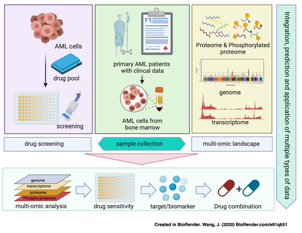 目前已有多项研究(TCGA、BeatAML等)使用基因组测序、蛋白质定量等组学技术收集并建立了AML的多组学数据库,这些研究为AML突变的分布和频率、亚克隆结构、疾病过程中的克隆进化以及疾病的表观遗传景观提供了前所未有的视角,也为临床提供了更多的潜在治疗靶点与治疗方案。然而,目前仍然缺乏更全面的多组学特征与药物敏感性相结合的研究。