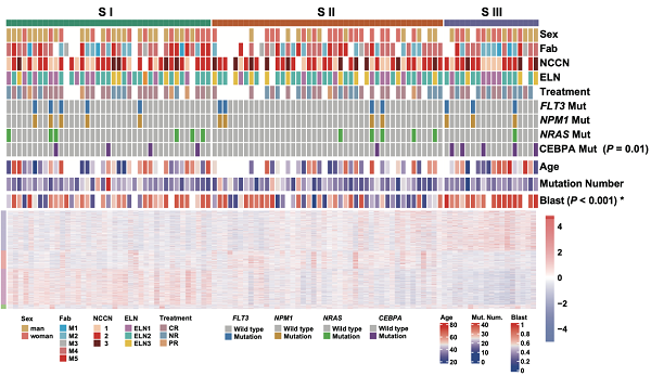 本研究基于无监督聚类和AML的蛋白质组学数据将AML样本分为了三类亚型(图2),尽管三类亚型没有显著的预后差异,但是S-I型的患者在诱导化疗后可测量残留病灶(MRD)较高,反映出其治疗后清除效率较低,疗效较差。结合临床数据进一步分析该研究发现,异基因造血干细胞移植(Allo-SCT)并未延长S-I型患者的生存期(对数秩检验,P > 0.05)。然而,S-II&III型患者明显受益于Allo-SCT。这些结果表明Allo-SCT可能是S-II&III亚型的潜在治疗策略。