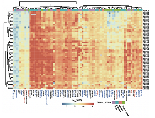 图3 56例AML患者样本中77种化合物的药敏数据热图。已批准用于AML治疗的药物标记为红色,处于临床阶段的药物标记为蓝色。