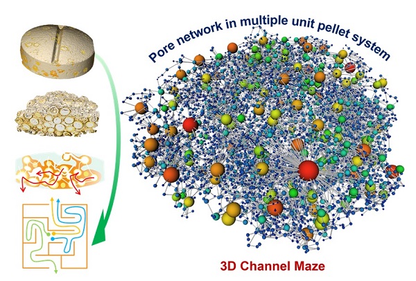 缓控释给药系统因其能够提供可控、可预测的药物释放速率,一直是药物递送领域的研究热点。药物的缓释、控释涉及多种机制,包括水分和药物的扩散、基质侵蚀、聚合物溶胀、渗透效应和离子交换等。其中,扩散是缓控释给药系统或传统剂型的基本机制。以扩散作用为主要释放机制的给药系统可分为两大类:储库型系统和基质型系统。以微丸压制缓释片为代表的多单元微丸给药系统是一种新型的缓控释给药系统,具有避免药物局部浓度过高、患者依从性高、副作用少等优点。从制剂3D结构出发,揭示药物释放过程和机制,对深入理解剂型,尤其是以微丸压制缓释片为代表的高端制剂的体外和体内行为至关重要。同步辐射显微计算机断层扫描(SR-μCT)等先进成像技术为制剂结构研究提供了强大的3D结构研究工具,本研究应用SR-μCT对茶碱微丸缓释片进行3D成像,探究了缓释片整体结构及单微丸在释药过程中的内部结构变化,并结合微丸缓释片整体和单微丸的释放动力学特征,提出了“3D通道迷宫”的药物缓控释放新机制(图1)。
