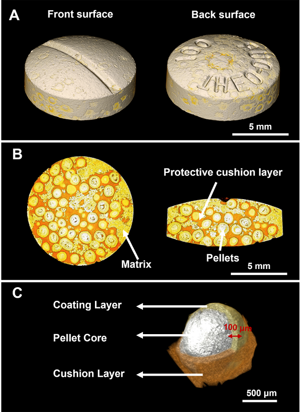 图2 茶碱微丸缓释片原位结构:(A)茶碱微丸缓释片的3D结构;(B)茶碱微丸缓释片的内部切片结构;(C)茶碱微丸缓释片内部微丸的3D结构