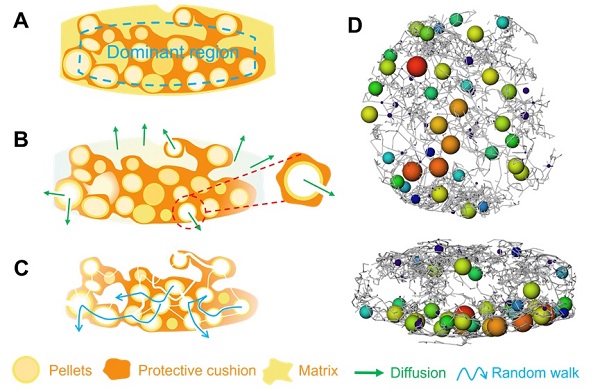 图3 “3D通道迷宫”释放模型:(A)茶碱微丸缓释片内部结构;(B)释放初始阶段:药物通过扩散作用进行释放;(C)缓控释阶段:药物通过“3D通道迷宫”模型进行释放;(D)茶碱微丸缓释片内的“3D通道迷宫”