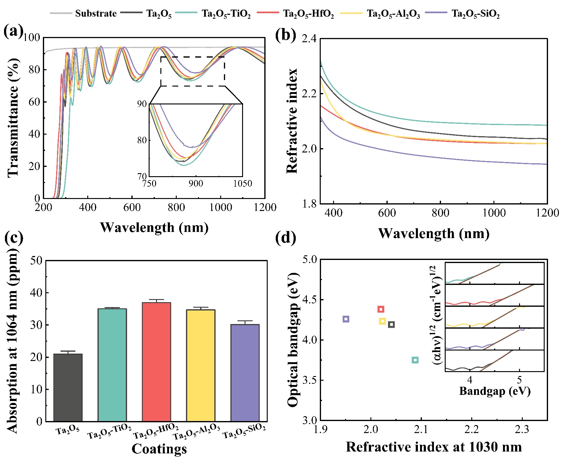 图1 氧化钽薄膜以及四种混合物薄膜的(a)透射率光谱;(b)折射率;(c)吸收以及(d)带隙对比。
