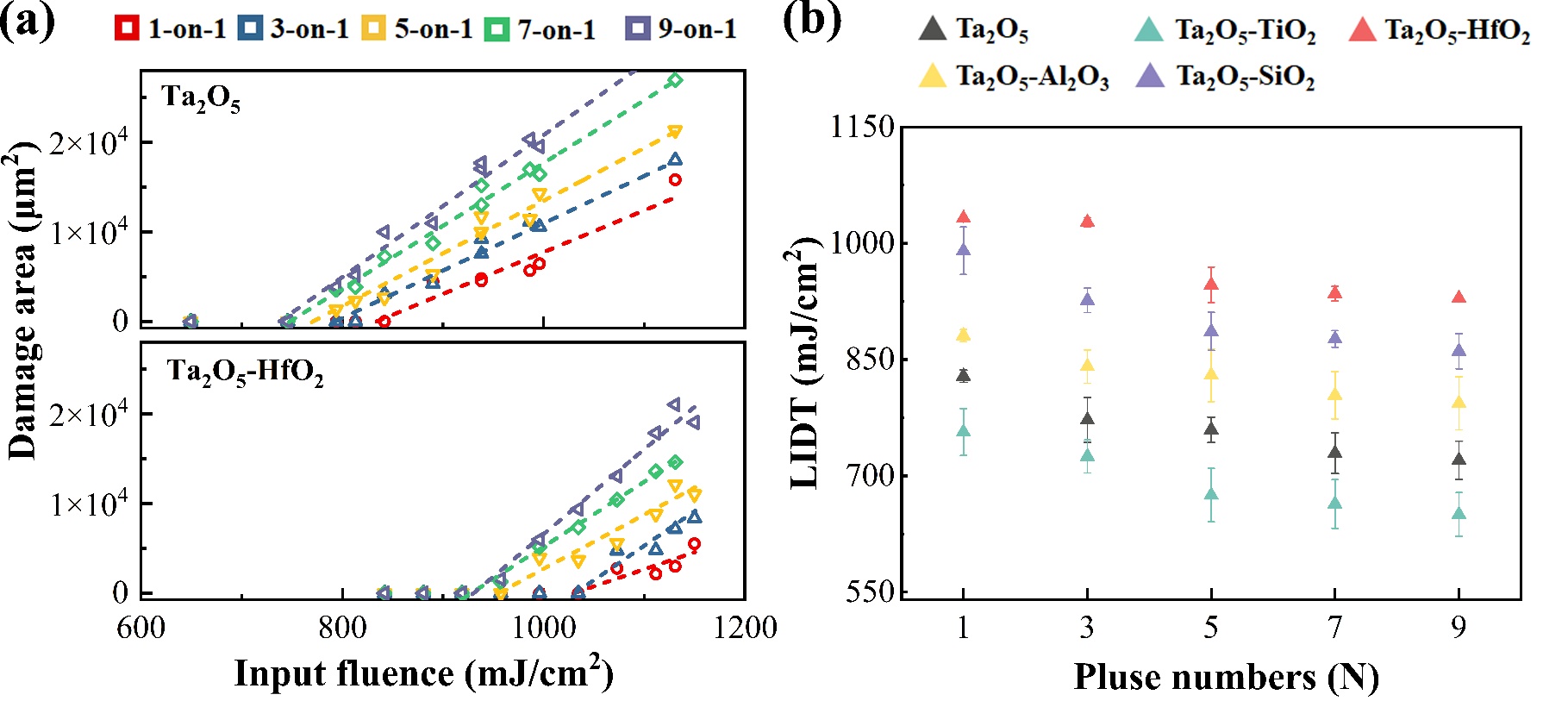 图2 (a)在S-on-1(S=1,3,5,7,9)LIDT测试模式下,激光诱导损伤面积与激光能量密度的关系图;(b) 氧化钽薄膜以及四种混合物薄膜的激光诱导损伤阈值与激光脉冲数量的关系图。