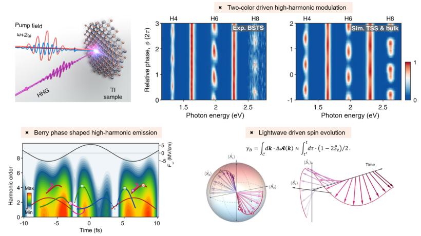 研究团队发现非绝热形似的Berry相位存在于固体高次谐波产生的带间极化机制中,亦被称为“带间Berry相位”。研究人员利用中红外双色场高次谐波光谱学手段,对Berry相位引发的效应进行了观测。强的基频光激发高次谐波过程,实现了Berry相位的积累,而弱的倍频场的加入可以打破时间反演对称性,将Berry相位信息映射到偶次谐波光谱的调制上。研究表明,双色场时间延迟依赖的偶次谐波强度调制与拓扑表面态的带间极化动力学过程密切相关。得益于拓扑绝缘体的强自旋-轨道耦合作用,研究团队揭示了强光场驱动下的拓扑表面态带间Berry相位效应,以及其在微观超快电子动力学中的关键作用。