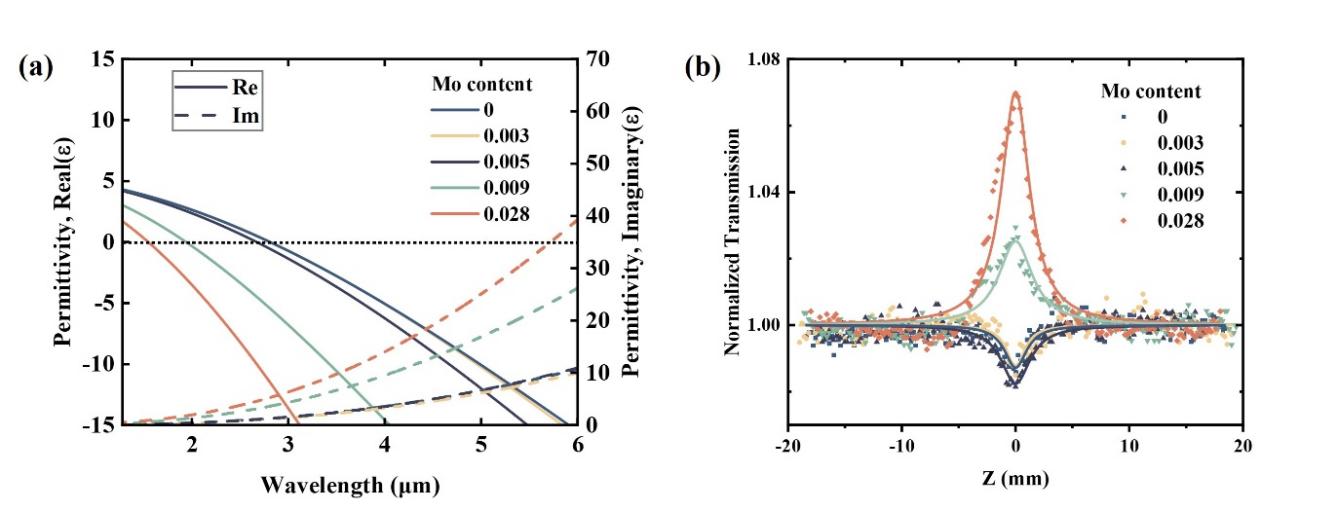 图 2. (a)MoxCd1-xO薄膜介电常数色散曲线;(b)MoxCd1-xO薄膜非线性吸收测试结果。