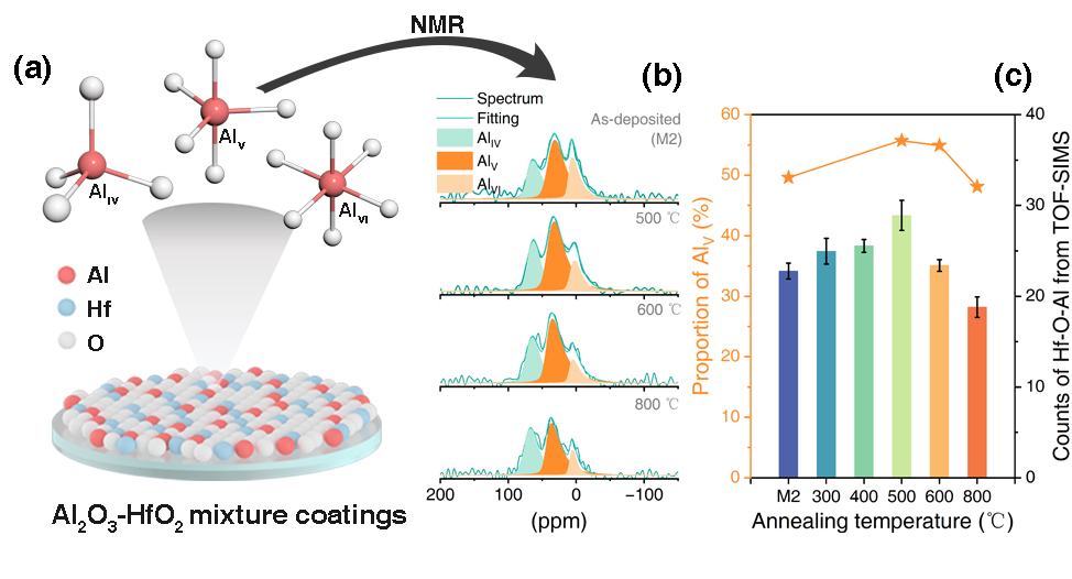 在这项工作中,研究人员聚焦于在抗激光损伤性能上表现出色的HfO2-Al2O3混合物薄膜,通过改变薄膜的混合比例以及改变薄膜的退火温度来研究HfO2-Al2O3混合物薄膜的内部结构与化学成份的演变。研究结合了多种表征技术,包括核磁共振谱(MAS-NMR)、飞行时间二次离子质谱 (TOF-SIMS)、X 射线光电子能谱 (XPS)、X射线衍射 (XRD)和透射电子显微镜 (TEM)。实验结果表明,HfO2的混入使得Al2O3薄膜由以六配位铝为主的连接结构转变为四五六配位铝共存的连接结构,且混合物内出现包含Hf-O-Al的三元化合物,其含量与五配位铝(AlV)的含量呈正相关,并进一步影响 HfO2-Al2O3混合物薄膜的润湿性。该研究有助于进一步理解HfO2-Al2O3混合物薄膜材料的微观结构,为新型薄膜研发提供材料基础。