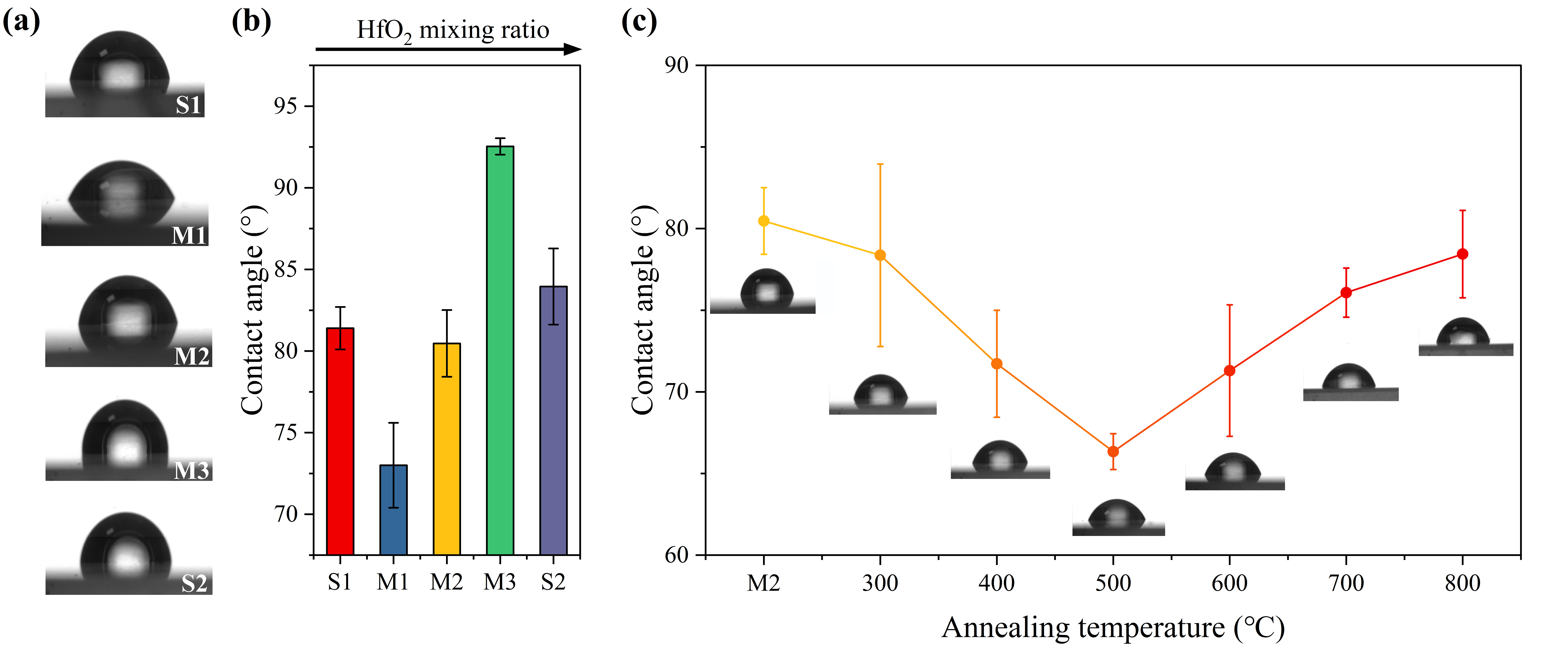 图 2. (a) 接触角仪中拍摄的水在 HfO2-Al2O3混合物薄膜上的照片以及 (b) 相应的水接触角。(c) M2 样品的水接触角与大气中退火温度的关系。