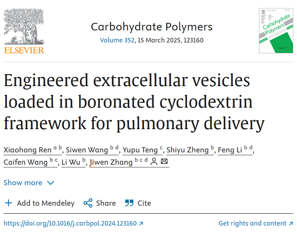 2024年12月23日,中国科学院上海药物研究所张继稳团队于Carbohydrate Polymers在线发表了题为“Engineered Extracellular Vesicles Loaded in Boronated Cyclodextrin Framework for Pulmonary Delivery”的研究论文。研究人员开发了一种新颖的纳米网格结构载体,包载工程化细胞外囊泡,用于肺部给药。
