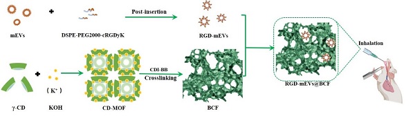 本研究基于环糊精金属有机骨架的有序结构,采用对称型硼酸酯键交联剂,对其进行交联,制备了一种由硼化环糊精框架(BCF)制成的纳米网格载体,纳米网格状结构由数十纳米直径的纳米纤维交织而成,分布有10-300 nm的开放空间;同时,硼酸酯键交联剂赋予BCF以pH/H2O2双响应性。而牛奶来源EVs(mEVs)的粒径为50-150 nm,处于BCF孔径的主要分布范围内,研究人员利用cyclo (Arg-Gly-Asp-D-Tyr-Lys) 多肽修饰mEVs(RGD-mEVs),发现RGD-mEVs比mEVs在细胞水平有更好的抗炎效果;BCF 能够捕获并保护RGD-mEV,形成RGD-mEVs@BCF,具有缓释效果且能响应性释放,在大鼠肺部给药时显示出良好的生物相容性。因此,RGD-mEVs@BCF可以“固化”EVs,为基于EVs的给药系统提供了一种新颖设计。综上所述,RGD-mEVs@BCF可作为肺部给药的潜在治疗平台,用于治疗肺部疾病,尤其是炎症性疾病。