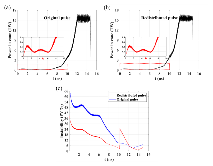 激光脉冲在传输过程中会受到多种因素的影响(包括整形单元、泵浦源的不稳定等)导致脉冲的稳定性变差,但增益饱和效应会增强脉冲的稳定性。对于高对比度的激光脉冲而言,脉冲的高功率部分率先达到增益饱和,而低功率部分则几乎保持线性放大,这不利于提升驱动激光早期的时域控制精度。鉴于此,研究人员针对DCI方案提出一种脉冲分割模型,在满足驱动内爆的近等熵纳秒压缩波形的前提下,对装置内各子束的时间-功率曲线进行重新分配,以降低各子束的波形对比度。利用少数子束产生低功率的足脉冲,聚焦在初始半径的靶面上,以提供更好的照明均匀性,剩余子束产生高功率驱动主脉冲,聚焦在相对较小的靶面上,这样可以使足脉冲也能达到增益饱和,同时还可减轻交叉光束能量转移(CBET)的影响。模拟结果表明,这种脉冲分割模型有利于增强足脉冲的稳定性。考虑到三倍频输出情况,重新分配的脉冲在冲击压缩阶段和斜坡调熵阶段具有更好的稳定性,分别从 50% 和 20% 提高到 26% 和 6.1%。该时空调制方案有望提高装置的功率平衡控制能力,实现动态焦斑控制,为双锥对撞(DCI)点火方案以及甚多束激光驱动点火方案的纳秒激光时空调控能力提升提供参考。