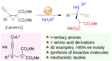 中国科学院福建物质结构研究所房新强课题组一直致力于含末端炔烃单元底物在铜催化下的转化研究,利用原位生成的铜联烯亚甲基中间体,实现了一系列新颖的反应。近期,房新强课题组利用这种策略成功完成了含末端炔烃单元的四取代供体-受体环丙烷的高效亲核开环反应,以较高的对映选择性生成多种α-三级胺,这是对传统路易斯酸催化的有效补充。关键中间体是铜联烯亚甲基I及其1,3-两性离子共振结构II,这种模式为实现供体-受体环丙烷的不对称反应提供了一种全新的方法。相应的产物含有胺、炔烃和酯官能团,能够进行多种进一步的转化,例如含氮生物活性化合物和药物分子的不对称合成。