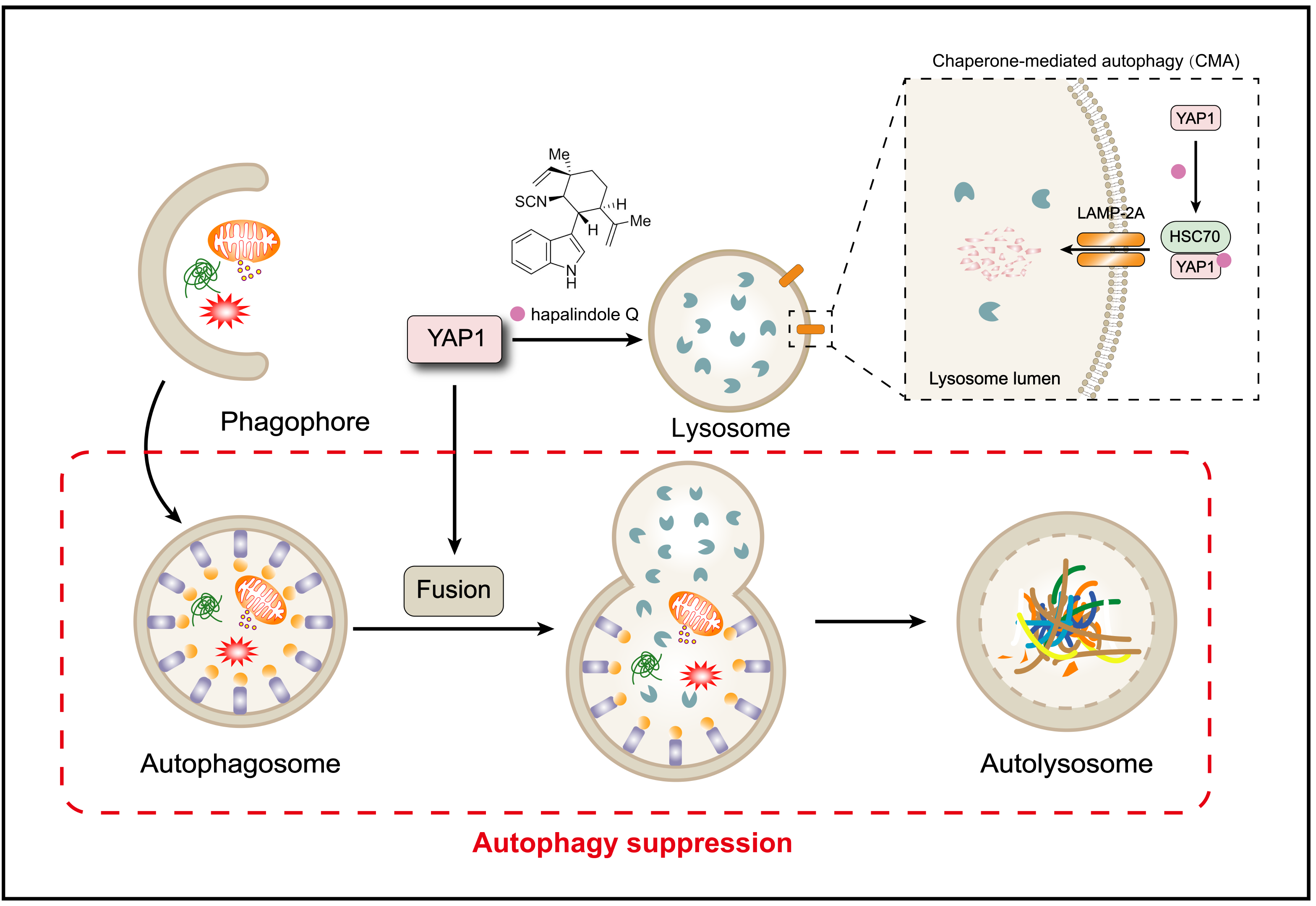 图.天然产物hapalindole Q的作用机制示意图。该化合物与YAP1结合,并诱导其通过伴侣介导自噬发生非经典降解。这一过程影响了自噬体与溶酶体融合,从而抑制了巨自噬。