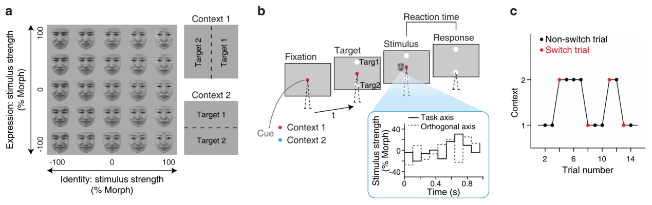 图1:(a)面孔刺激集。该刺激集具有性别、表情两个维度。(b)试次示例。(c)任务规则切换频率。