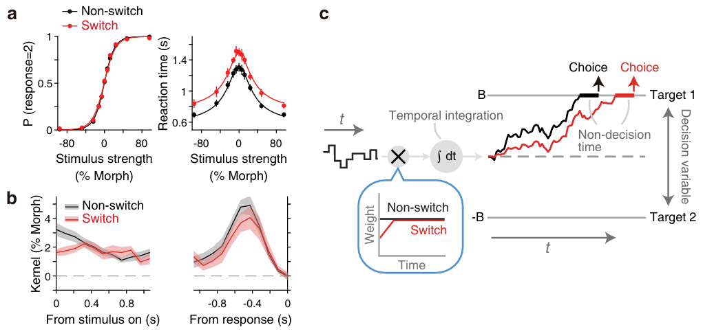 图2:(a)在任务切换后的第一个试次中,实验参与者的反应时间显著增加。(b)心理物理逆相关分析显示任务切换后感知权重下降。(c)加入一个动态的感知权重函数后,证据累积模型可以解释切换成本的出现。